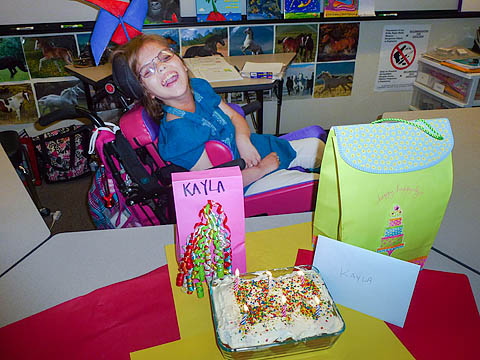 And now its my birthday! I got to celebrate my birthday over many days.. :) It was so cool! I turned 16 this year. So, here I am making cupcakes for my birthday party at school. However, I just finished flipping the bowl of cake mix right before it was ready to be stirred all over the place. Mom had to clean it all up, including me, my wheelchair, the floor, walls, cupboards, which is why I am now in my bean bag.